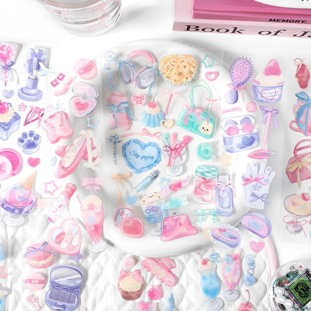 パステルカラーでデザインされたキュートなシートシールです。1つ1つのデザインが大きめなので、手帳や手紙に貼ると存在感があり可愛さ抜群です。はさみ等でカットしてお使いください。