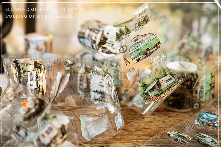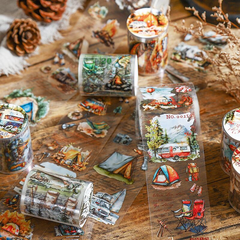 キャンプの楽しさをデザインしたマスキングテープです。四季折々の美しい風景を感じることができる魅力的なイラストが施されており、日常のアイテムに自然のエッセンスをプラスします。手帳やラッピング、コラージュなどにおすすめです。