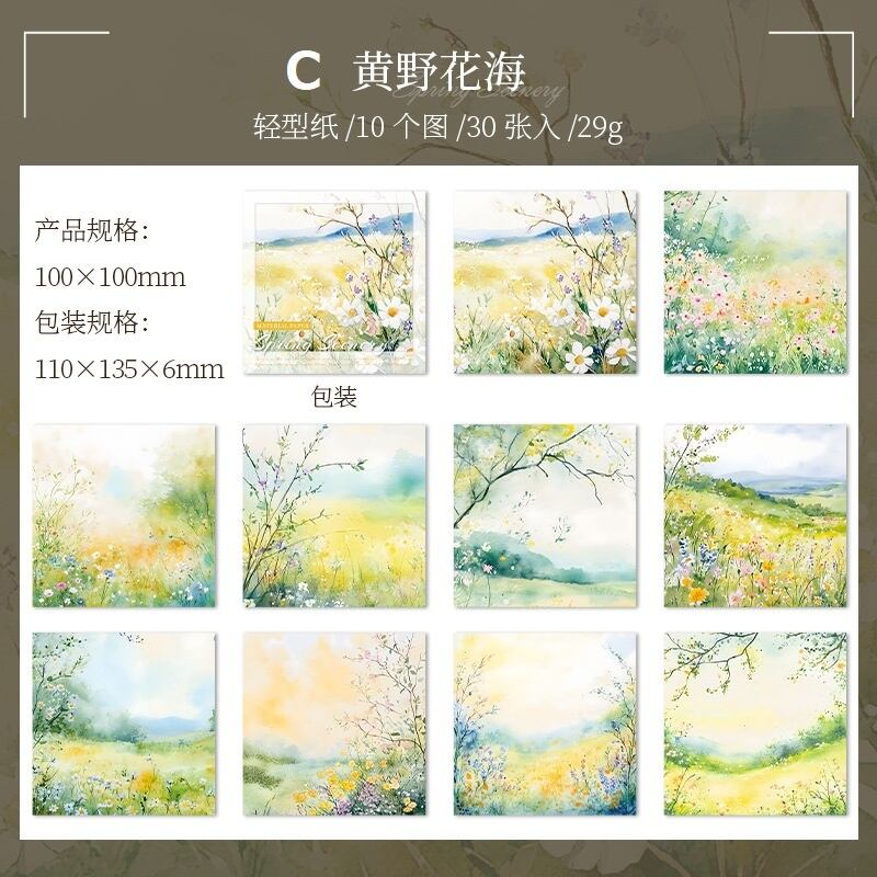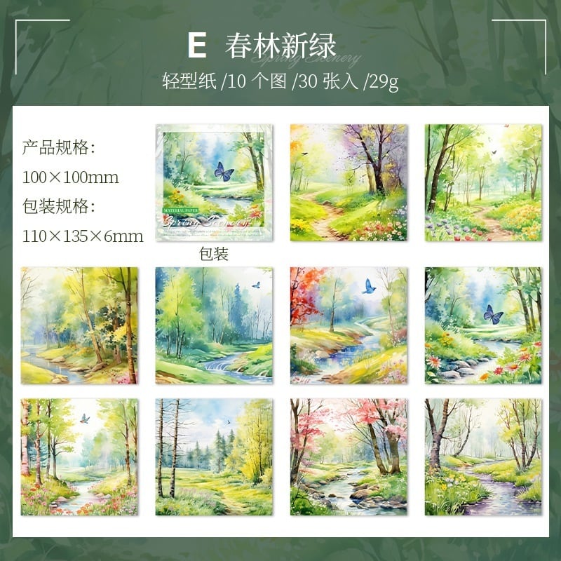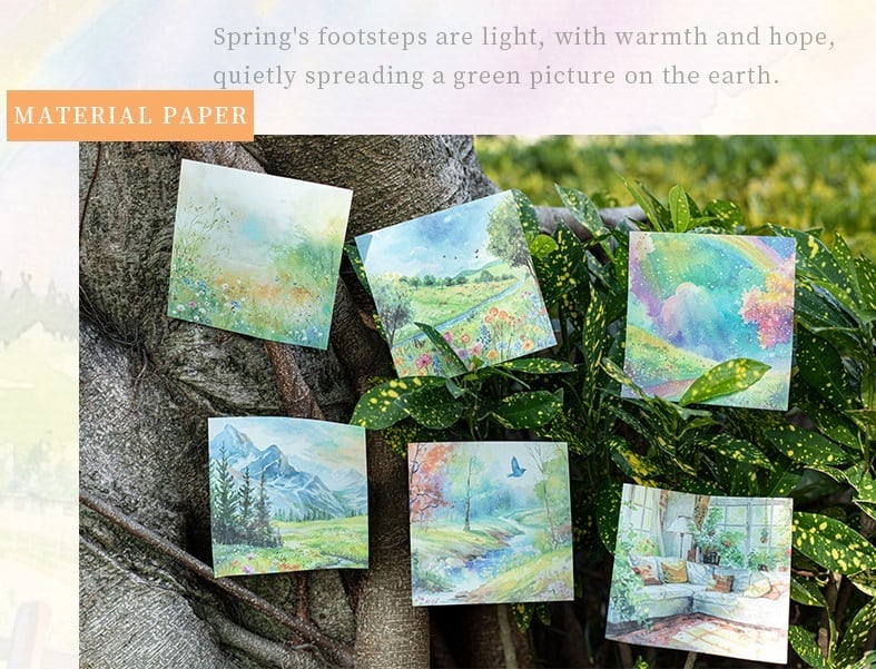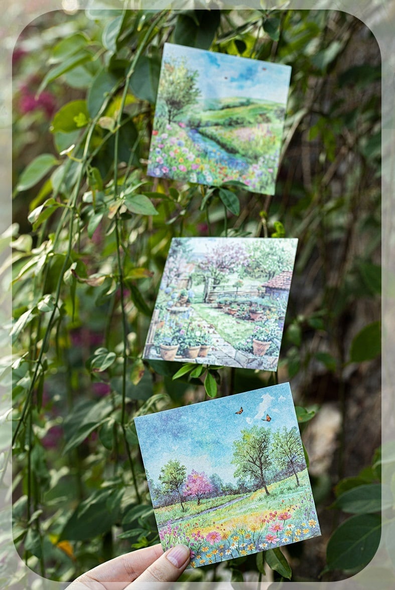 美しい風景を描いた、心温まるデザインの素材紙です。春の訪れを感じさせる穏やかな色合いと独自のタッチが特長で、クラフトやメッセージカードの作成にもおすすめです。